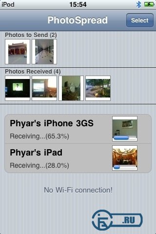 — PhotoSpread был разработан для передачи фотографий и видео сделанные на камеру iPhone. Видео, которое вы синхронизовали из медиатеки iTunes, не может быть передано. Устройства с iOS3.x прошивкой (в том числе и iPad) могут принимать только видео.