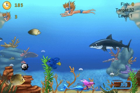 Эта игра, небольшой симулятор рыбалки, в котором вы будете заниматься подводной охотой и должны за определённое время поймать определенное количество рыб, но это будет не настолько легко, ведь есть акулы и бомбы, которые будут вам мешать. Будьте осторожными! Чёго же вы ждёте? Вперёд!
